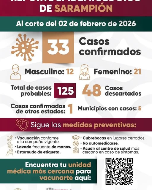 Puebla.- Al 2 de febrero de 2026, el reporte epidemiológico mantiene 33 casos confirmados de sarampión, distribuidos en cinco municipios, informaron autoridades de salud, quienes reiteraron el llamado a fortalecer las medidas de prevención, principalmente la vacunación.