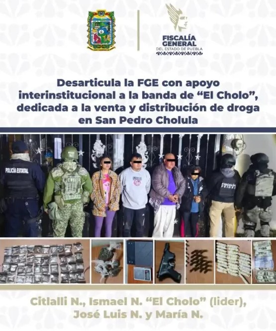 San Pedro Cholula, Pue. – La Fiscalía General del Estado (FGE) de Puebla, con apoyo interinstitucional, detuvo a los integrantes de la banda conocida como “El Cholo”, dedicada a la venta y distribución de drogas en el municipio, tras un cateo realizado en una narcotiendita localizada en la junta auxiliar de Santa Bárbara Almoloya.