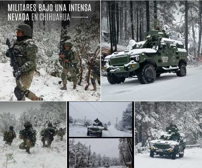 Nacional.- Elementos del Ejército Mexicano realizaron patrullajes de vigilancia en caminos de la Sierra de Chihuahua tras la nevada registrada la tarde y noche del lunes en la región sur del estado.