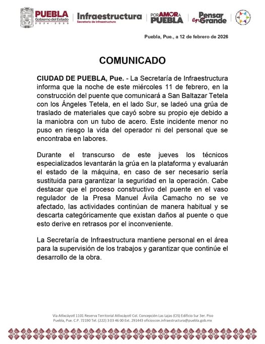 Ciudad de Puebla, Pue.— La Secretaría de Infraestructura informó que la noche del miércoles 11 de febrero se registró un incidente menor durante los trabajos de construcción del puente que conectará a San Baltazar Tetela con Los Ángeles Tetela, en el lado sur de la obra.