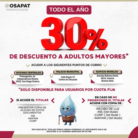 Tehuacán, Puebla.— El Organismo Operador de los Servicios de Agua Potable y Alcantarillado de Tehuacán (OOSAPAT) informó que durante todo el año las personas adultas mayores que sean titulares del servicio pueden acceder a un 30 por ciento de descuento en su recibo de agua.